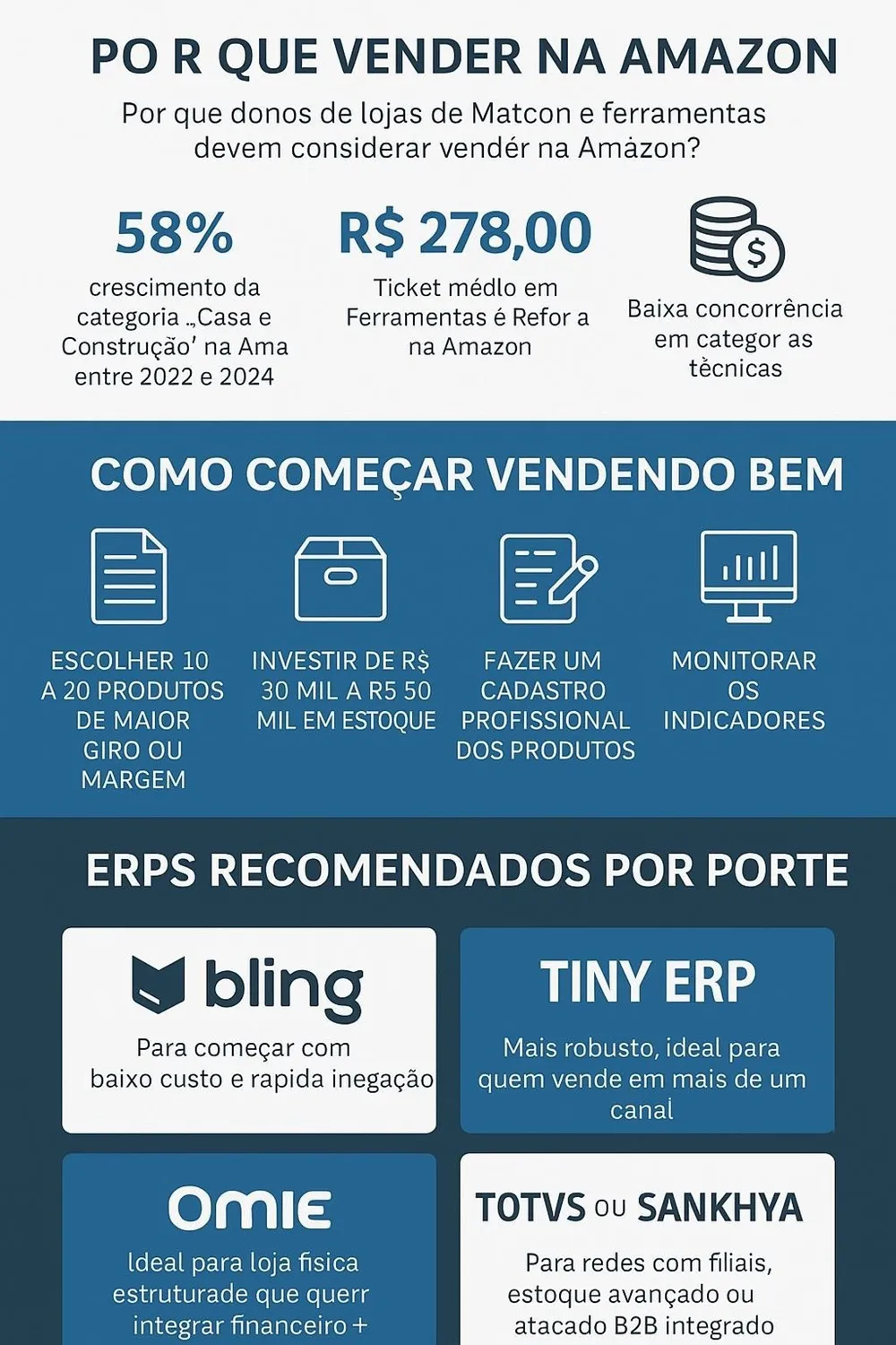 Se você é dono de uma loja de Matcom e ferramentas, este artigo vai mostrar por que a Amazon é uma oportunidade real, como entrar corretamente na plataforma e qual ERP escolher para manter sua operação saudável, automatizada e preparada para crescer.