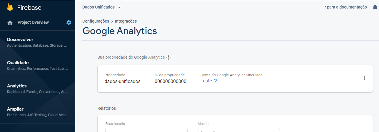 Nesse caso, a integração acontece direto no Firebase ao se configurar a integração Google Analytics na página de “Configurações do projeto”, na aba “Integrações”: