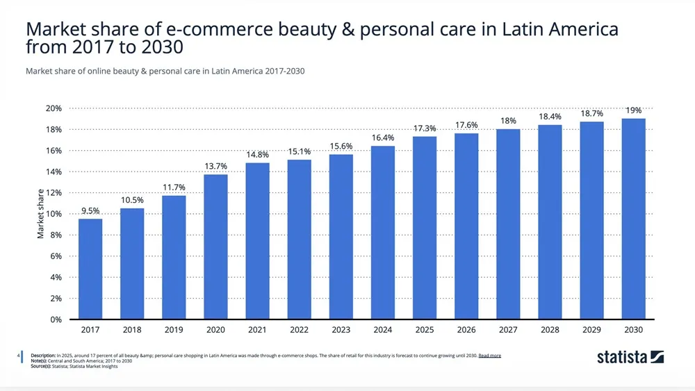 Em 2025, apenas 17,3% das vendas totais de beleza na América Latina acontecem via e-commerce, com projeção de atingir 19% até 2030. Mais de 80% do mercado ainda está fora do online.