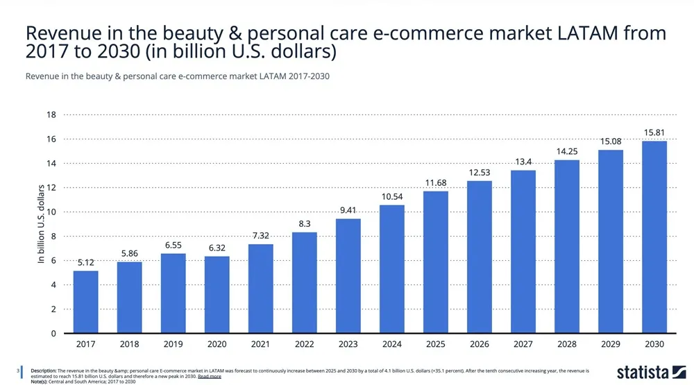 Segundo dados da Statista, o e-commerce de beleza e cuidados pessoais na América Latina deve atingir US$ 15,8 bilhões até 2030, após dez anos consecutivos de crescimento.