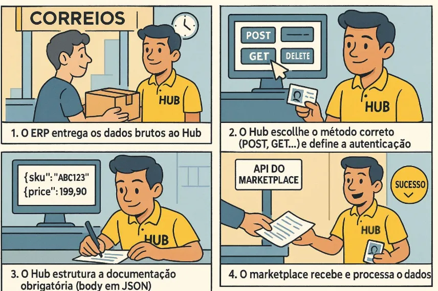 Com essa metáfora, conseguimos visualizar como funciona o caminho dos dados em uma integração entre ERP, hub e marketplace.