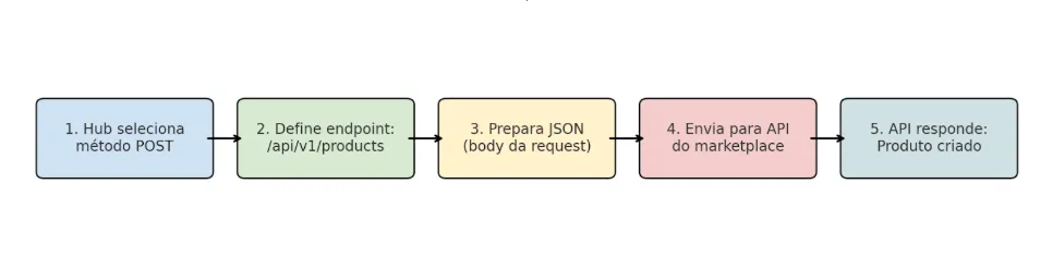 Cada interação que ocorre entre o hub e a API acontece por meio de uma request (requisição). É como enviar uma mensagem formal dizendo: “Quero que você (marketplace) execute uma ação com esses dados que estou te enviando.