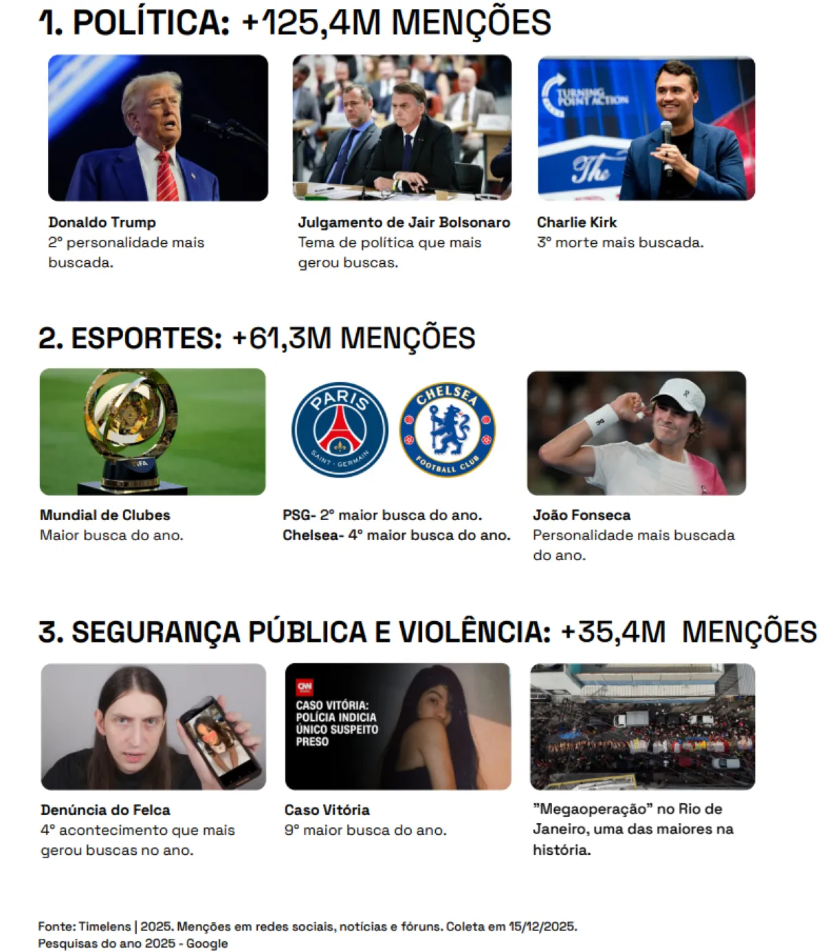 Entretenimento e esportes mantiveram liderança quando o recorte é sentimento positivo. Premiações culturais e grandes competições esportivas impulsionaram o engajamento, assim como clubes e torneios internacionais. No ranking de personalidades mais buscadas de 2025, o tenista João Fonseca liderou as pesquisas, seguido pelo político Donald Trump.