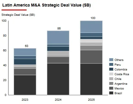 Nas Américas, o mercado de M&A estratégico avançou 52% na comparação anual. Estados Unidos e Canadá lideraram a retomada, com crescimento de 54% e 57%, respectivamente. Na América Latina, o Brasil manteve a posição de principal mercado da região em valor de transações, seguido pelo México.